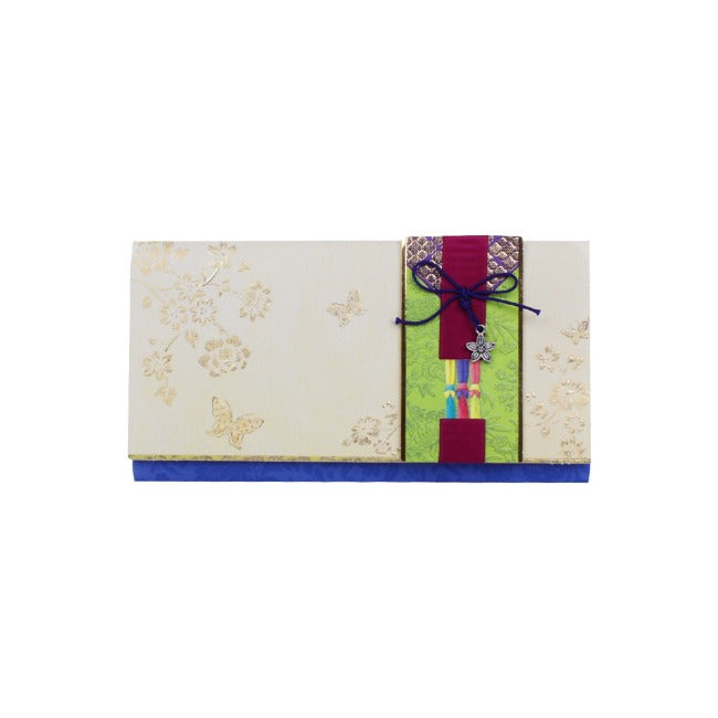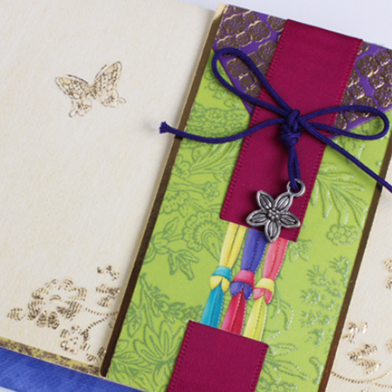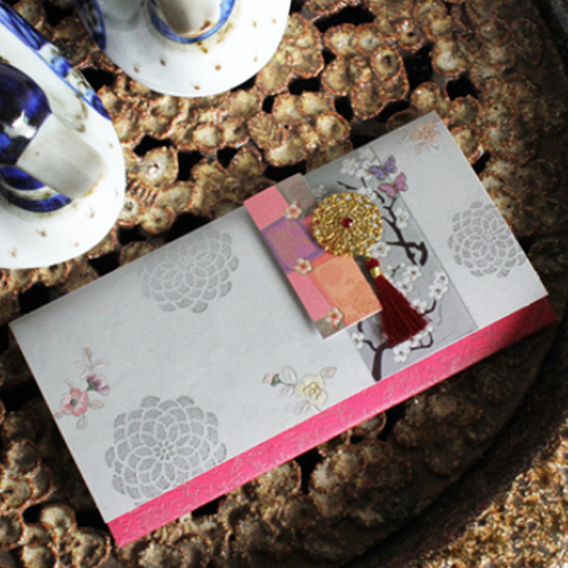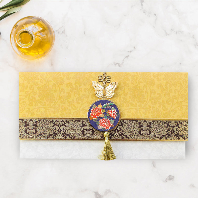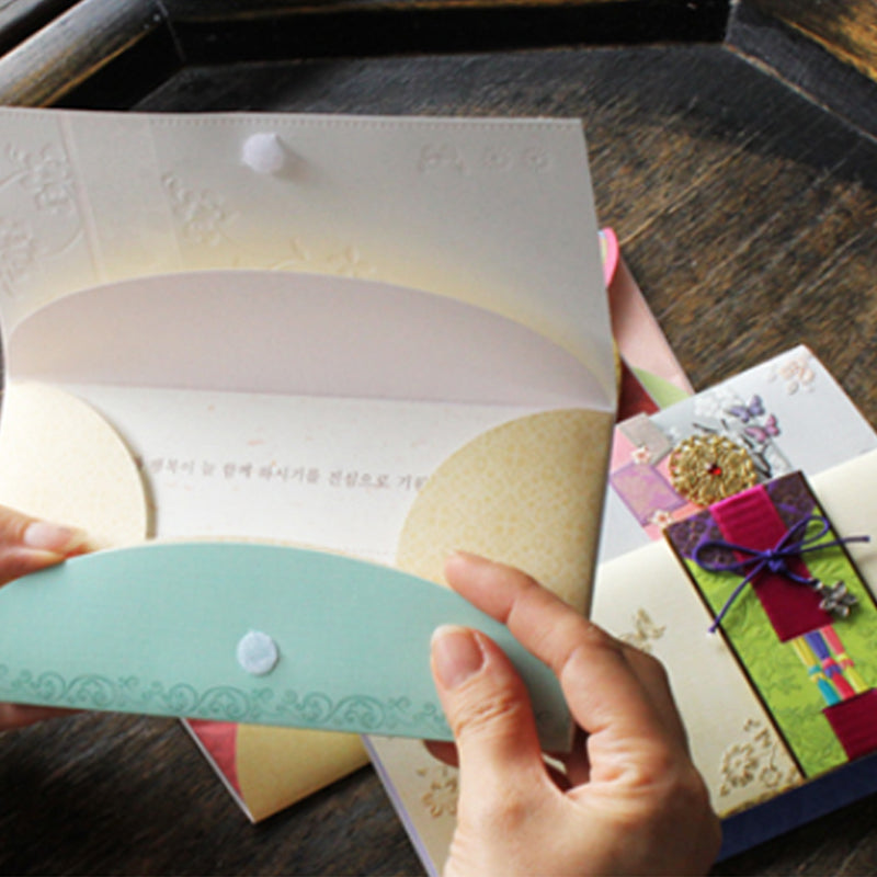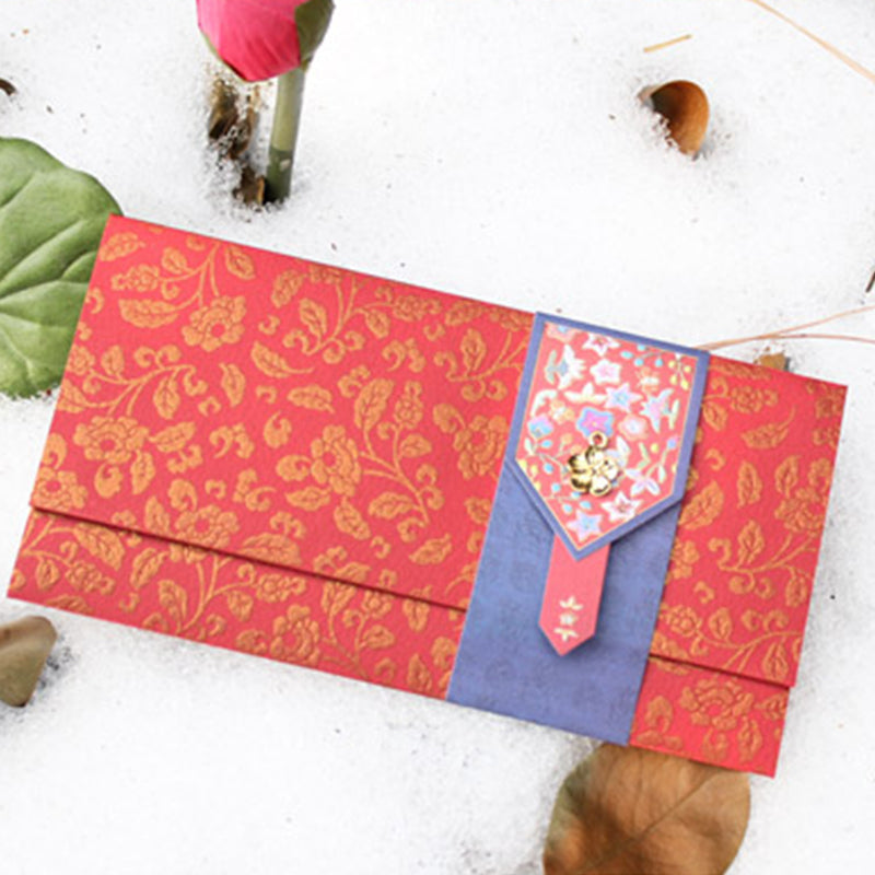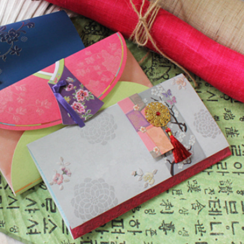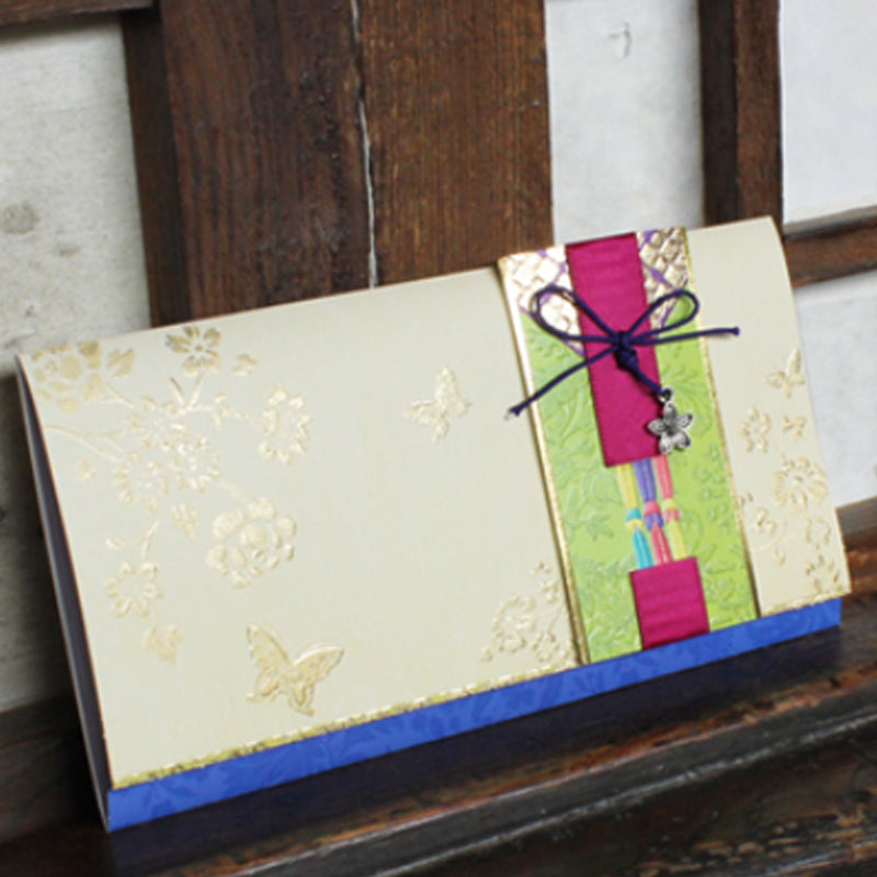 Este hermosísimo sobre coreano tradicional está elaborado con papel de alta calidad con detalles metalizados en color dorado. Además tiene hermosas aplicaciones en listón, papel y otros materiales que le dan un toque único.
